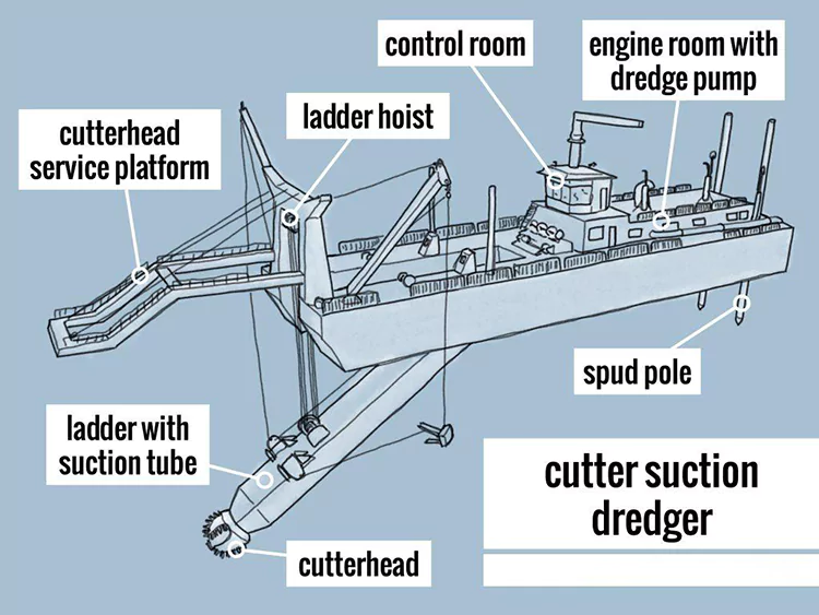 Pjovimo sistema: Priekiniame gale sumontuotas spiralinis pjaustytuvas, kuris dideliu greičiu purena ir susmulkina upėse esantį smėlį ir tinka įvairiems dirvožemio tipams, pavyzdžiui, smėliui, moliui ir akmenims.